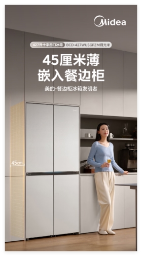 传统嵌入式冰箱的机身厚度普遍超过60cm,容易凸出餐边柜,不仅影响家居环境整体协调度,还容易造成磕碰。美的这款餐边柜冰箱通过技术革新,将厚度直接压缩至45cm——41cm箱体+4cm箱门,堪称美的史上最薄冰箱,可齐平嵌入餐边柜,与餐边柜融为一体。
