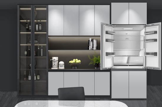 外观层面,隐界Pro采用全嵌入式设计思路,冰箱本体可适配定制门板,用户根据橱柜材质、色彩和纹理进行匹配,安装后冰箱正面与橱柜齐平,视觉上融为一体。机身尺寸为高1925mm、宽892mm、深568mm(不含门板),总容积600L。顶部配备全覆盖式顶灯,开门后箱内照明无死角。控制面板为全触摸屏,温度调节和模式切换通过触控完成。